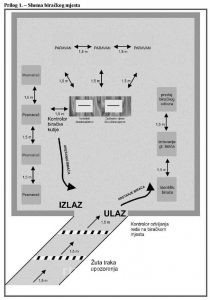 c) postave oznake kretanja birača s napomenom da na biračkom mjestu u jednom trenutku može biti samo onoliko birača koliko ima glasačkih kabina na biračkom mjestu;