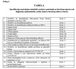 Članom 9. Instrukcije propisano je da predsjednik izborne komisije osnovne izborne jedinice zadužuje paket materijalno-tehničkih sredstava radi higijensko-epidemiološke zaštite iz Tabele koja je Prilog 3. ove instrukcije.