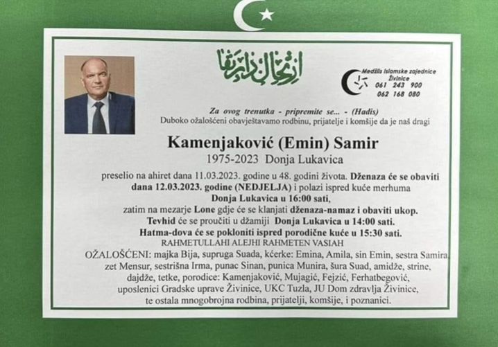 Povodom smrti gradonačelnika Grada Živinice Samira Kamenjakovića 12., 13. i 14. mart 2023. godine (nedjelja, ponedjeljak i utorak), proglašavaju se danima žalosti na području Grada Živinice.