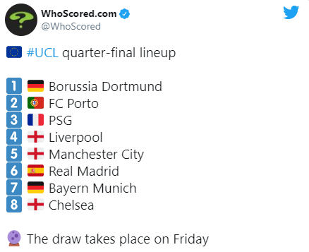 Osam ekipa koje su ostale u borbi za prvaka Evrope su branitelj naslova Bayern potom Chelsea, Liverpool, Manchester City, Porto, PSG, Real Madrid i Borussija Dortmund.