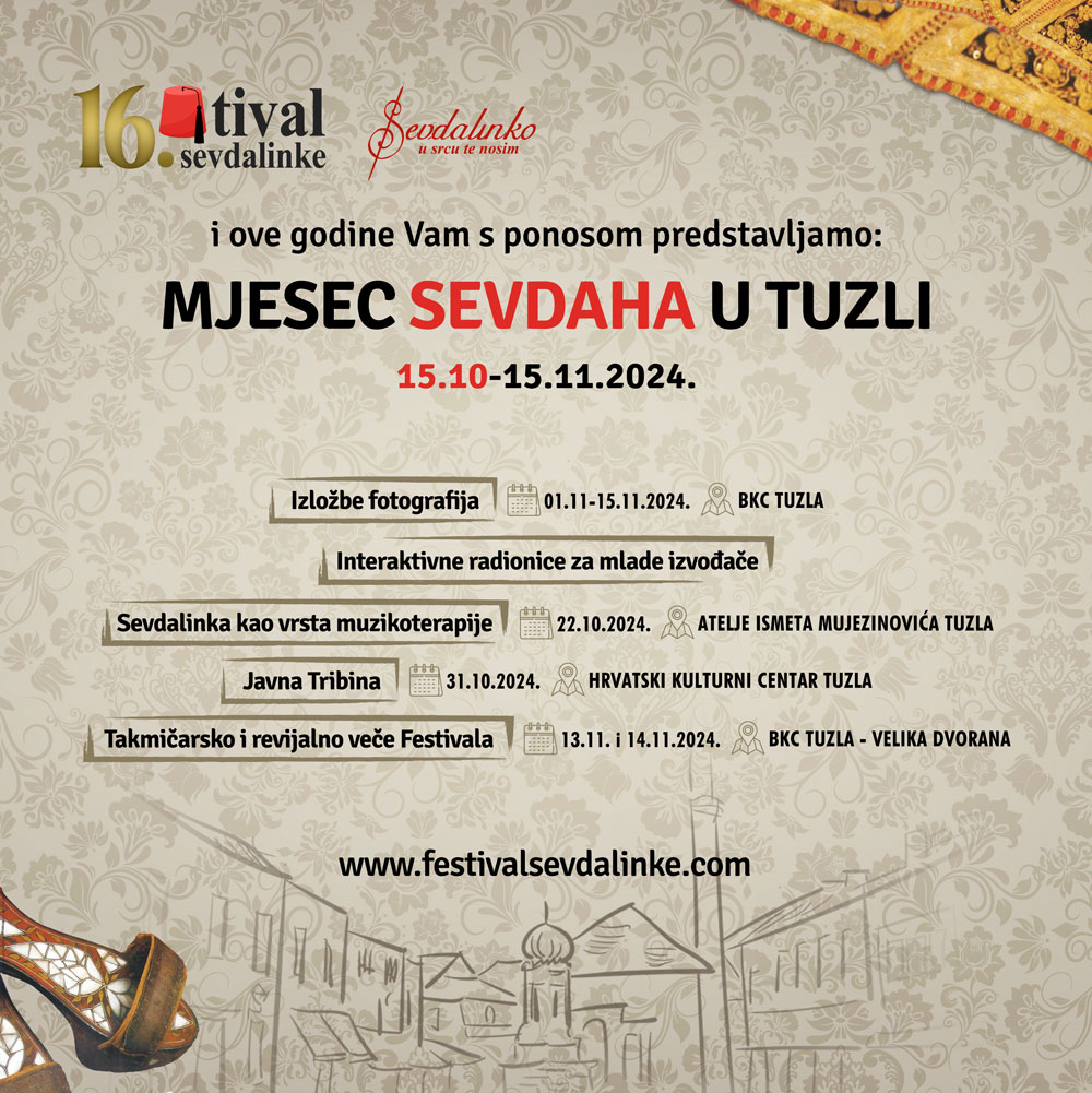 - Izložbu fotografija na temu sevdaha u BKC-u TK od 01. do 15.11.2024. godine, uz prethodni konkurs za odabir djela.